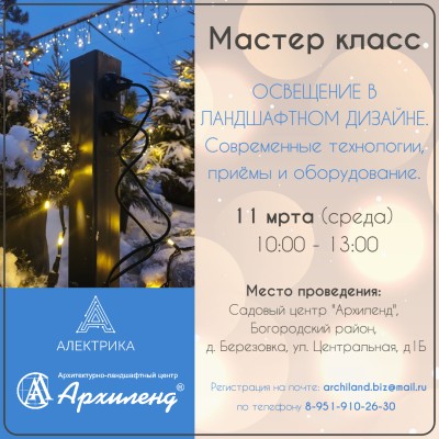 Мастер-класс «Освещение в ландшафтном дизайне. Современные технологии, приемы и оборудование». Спикер — компания «Алектрика»: разбор современных решений и технологий.
