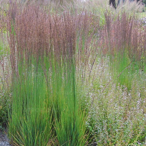 Сорт молинии "Мурекс" высотой до 120 см с метелками. Отличается невысоким ростом и широкими соцветиями фиолетового оттенка.