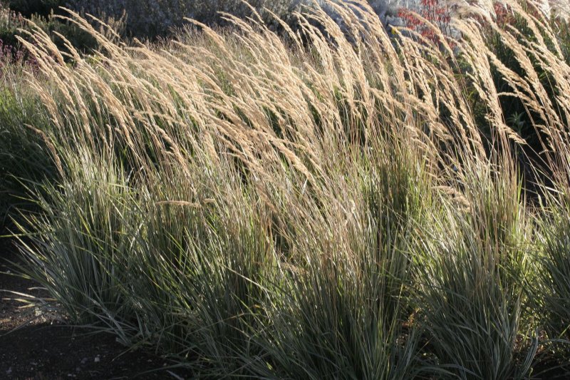 Соцветия: длинные, перистые метёлки (20–30 см) светло‑розового или бежево‑золотистого оттенка; появляются в июне–июле.