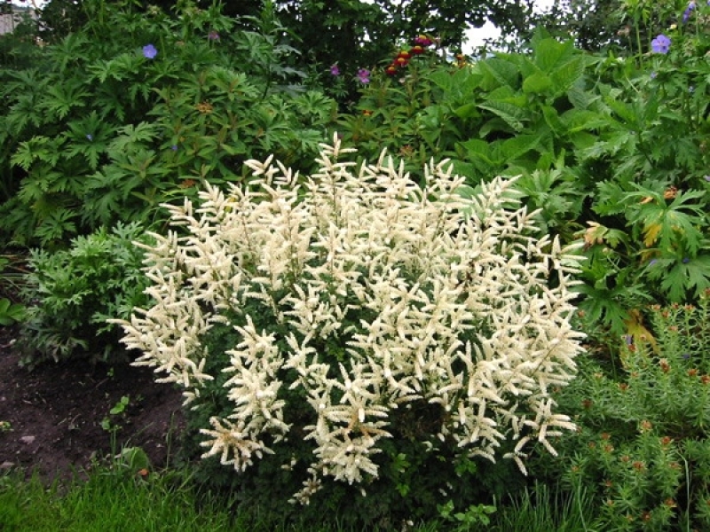Это красивоцветущий, плотный и компактный кустик, внешне очень похожий на астильбу, с пушистыми метельчатыми соцветиями, состоящими из многочисленных крошечных кремовых и белых цветочков, а так же ажурными светло-зелеными перисто-рассеченными листьями, красивыми в течение всего сезона. Это маленький кустик, высота которого доходит всего лишь 27 см.