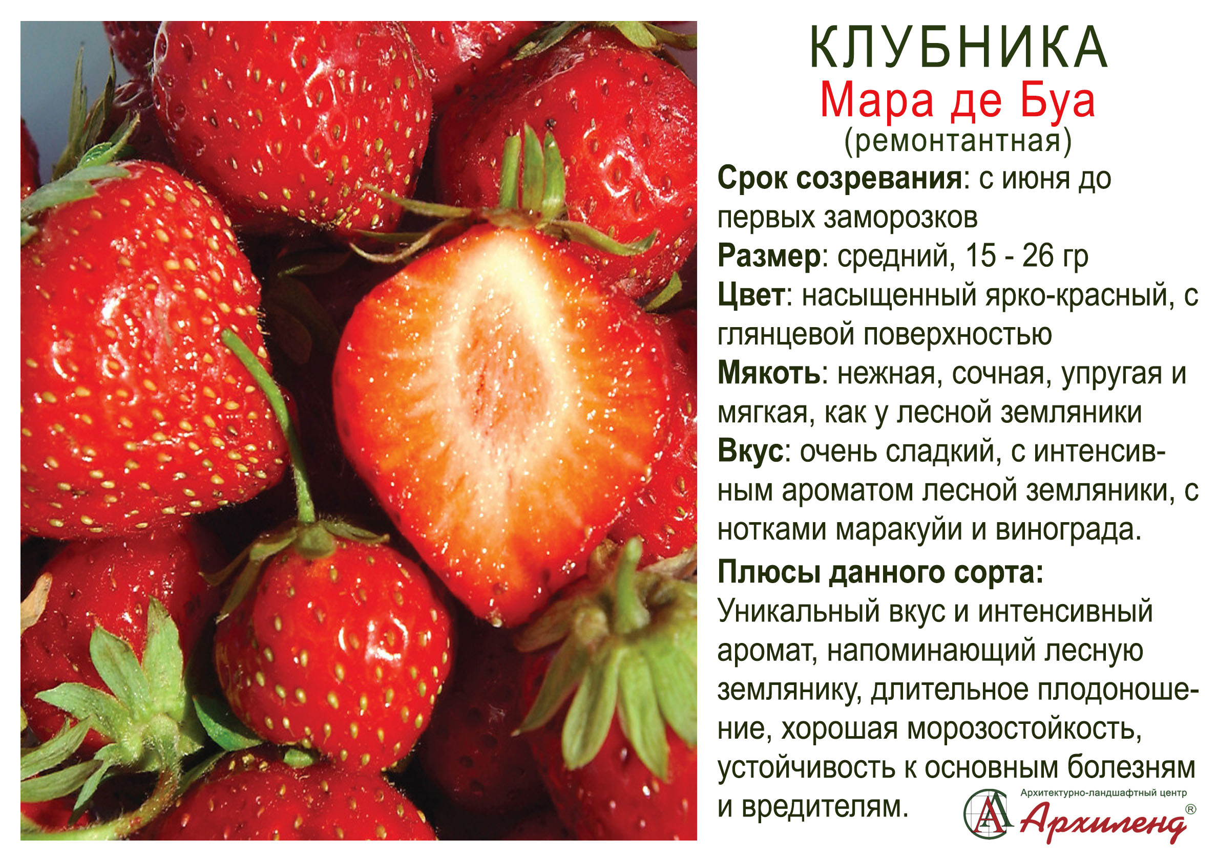 Сорт ремонтантный с хорошей устойчивостью к болезням. Куст компактный, хорошо облиственный. Плоды крупные (20-25 г), красные, блестящие, с выдающимися вкусовыми качествами. Урожайность выше средней, ягоды немного мельчают к середине лета, но ягоды весеннего и осеннего урожая достаточно крупные. Сорт пригоден для выращивания в теплицах, вертикальной культуре и открытом грунте.