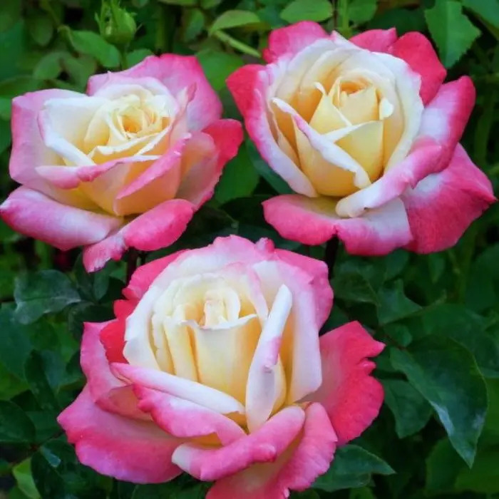 Цветки. Крупные, диаметром 10–12 см (по другим данным — до 15 см), классической чашевидной (бокаловидной) формы, состоят из 25–28 лепестков. Окраска — кремовая с нежным розовым румянцем по краям (по другим данным — внутри кремово-белые с розовым оттенком, а внешние лепестки тёмно-розовые). Аромат лёгкий, классический, с нотками розового масла (по другим данным — с фруктовыми нотками, напоминает свежесть весеннего утра).